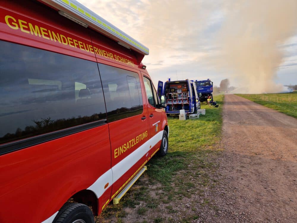 Am Freitag, den 07.04.23 um 16:01 Uhr wurden wir mit dem ELW 1 der Gemeinde Schkopau zu einem Strohdiemenbrand nach Kollenbey alarmiert. Als Führungsunterstützung für den Einsatzleiter übernahmen wir die komplette Einsatzdokumentation und die Koordination der Facheinheiten, wie THW und der Drohnengruppe der Feuerwehr Bad Dürrenberg. Knapp 9 Stunden wurde der Strohdiemen, bestehend aus rund 330 Ballen, auseinandergezogen und abgelöscht, sodass ab Mitternacht bis zum 08.04.23 um 11 Uhr eine Brandwache durch die Feuerwehr ausreichend war.
